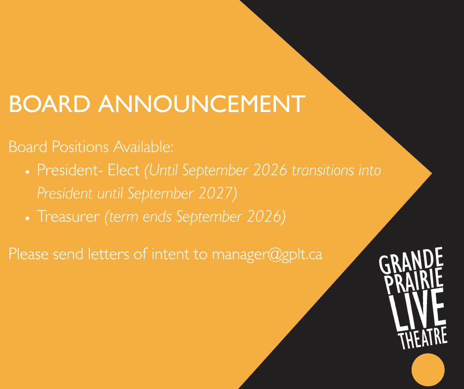 Grande Prairie Live Theatre would like to acknowledge the recent resignations of Amy Jefferies, President-Elect, and Agnes Pasko, Treasurer. We thank both