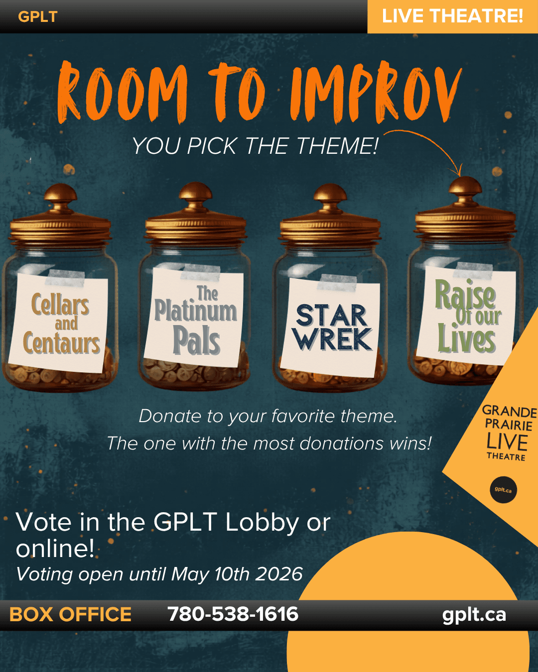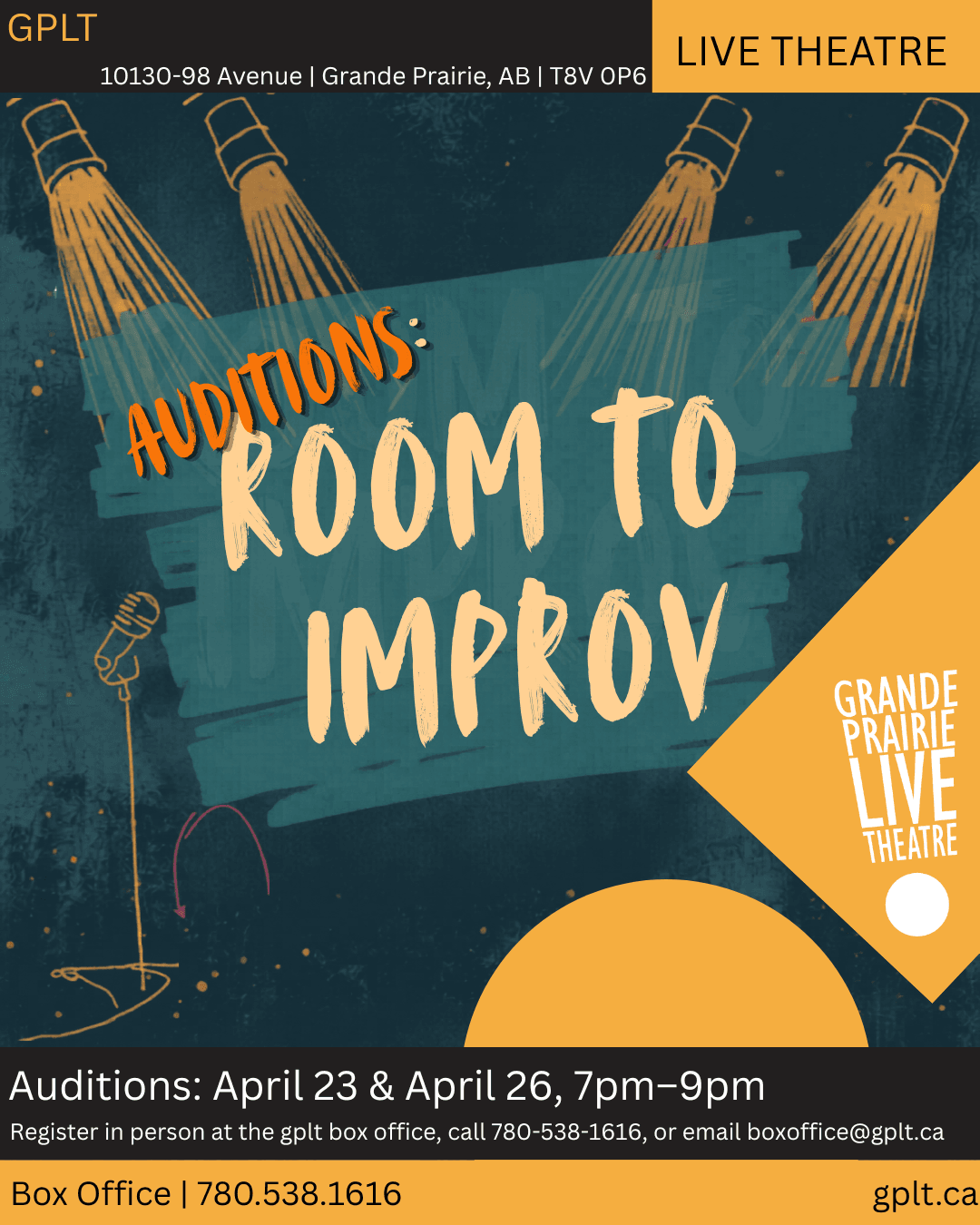 Grande Prairie Live Theatre is more than performances—it’s community, creativity, and connection. Whether you’re joining us in the audience, stepping on stage, or lending a hand behind the scenes, there’s a place for you here.