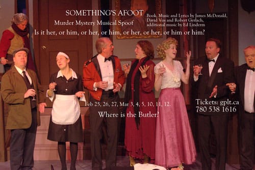 WIN free tickets to Something’s Afoot! Call 780 538 1616 at 3 pm on Wednesday February 24 or 3 pm on Thursday February 25. The first 3 GPLT Friends to call Grande Prairie Live Theatre at these times win 2 free tickets to the Friday February 26 performance of this murder mystery musical spoof. No exchanges, no refunds, no cash value.