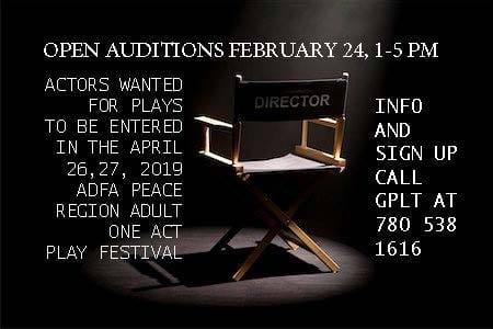 Peace Region One Act Play Festival Group Auditions February 24 from 1 to 5 pm at GPLT Acting in a One Act Play is the perfect start to becoming an […]