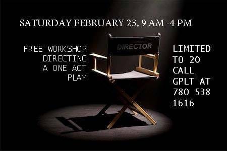 GPLT is hosting a How to Direct A One Act Workshop on Saturday February 23. Limited to 20. Register by calling GPLT at 780 538 1616 or email: box.office@gplt.ab.ca. There is NO cost and a FREE lunch is included. You MUST commit to stay for the entire workshop from 9 am to 4 pm.