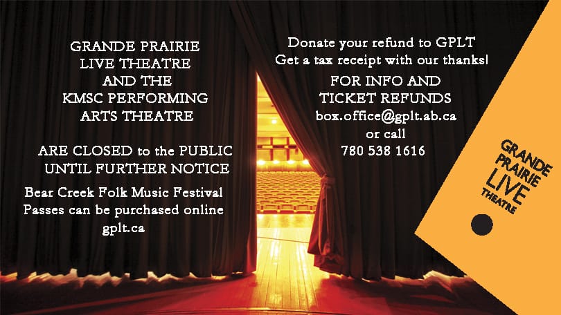 Grande Prairie Live Theatre and KMSC Performing Arts Theatre Closed with Bear Creek Folk Festival Passses available for purchase online at gplt.ca
